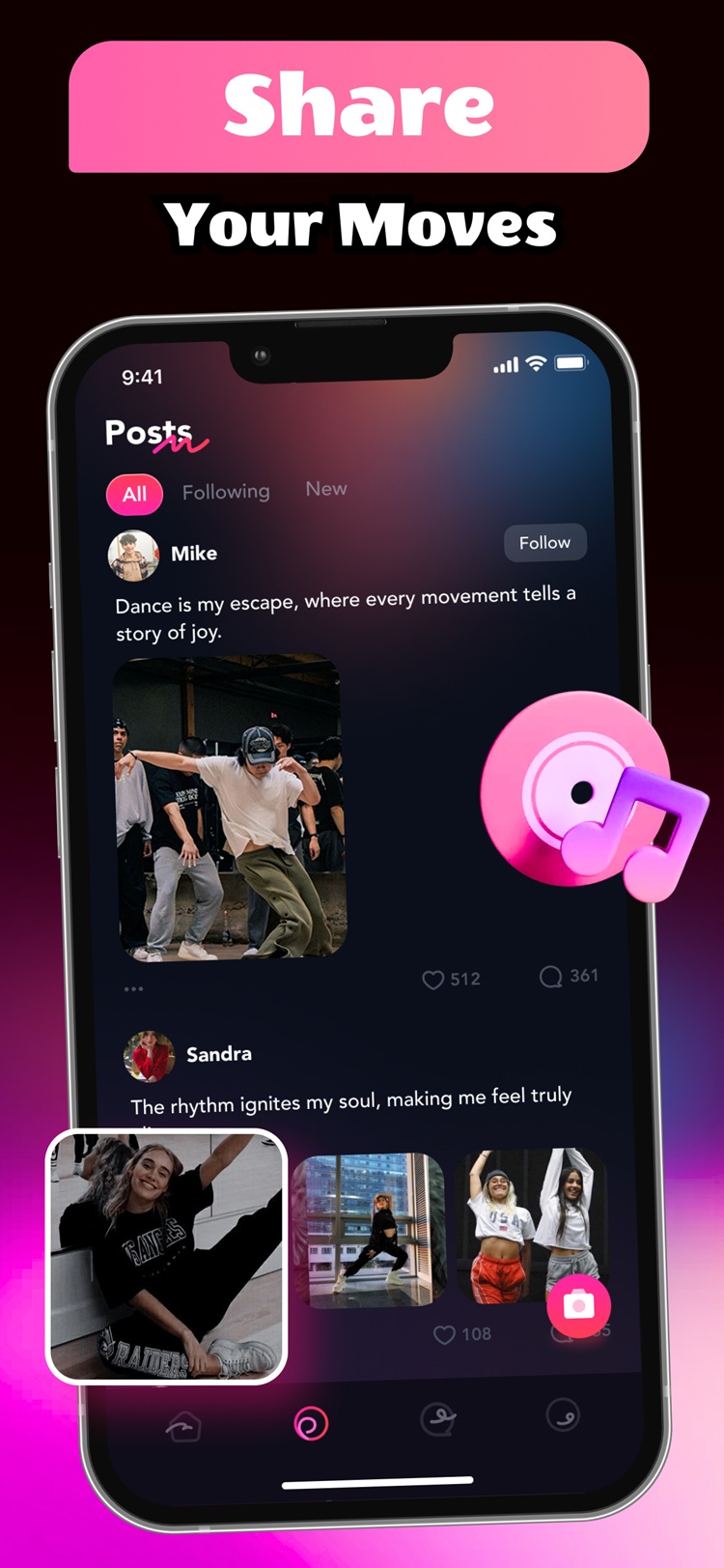 Post updates about your dance journey, showcase your moves, or find inspiration from others in the community.